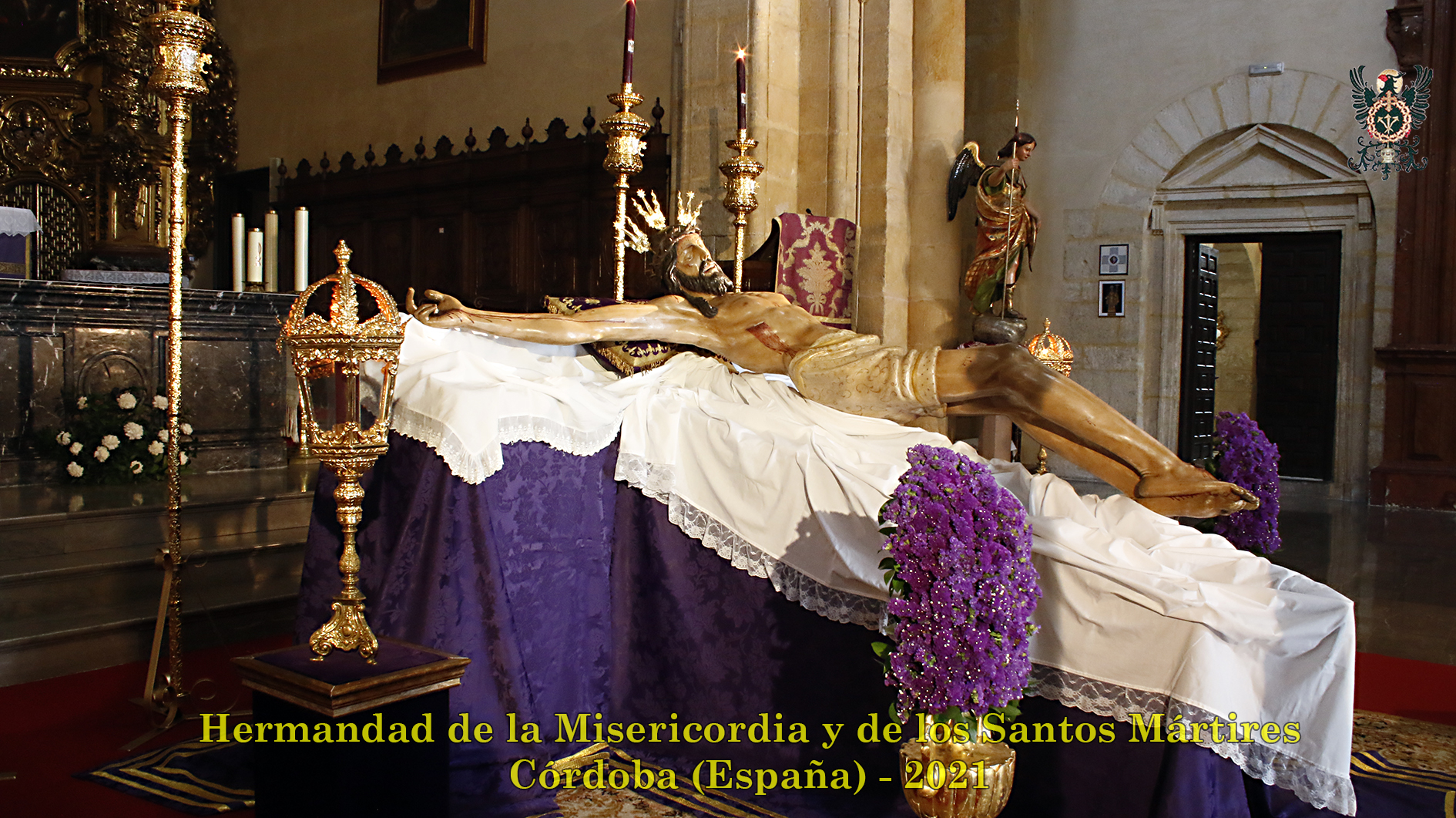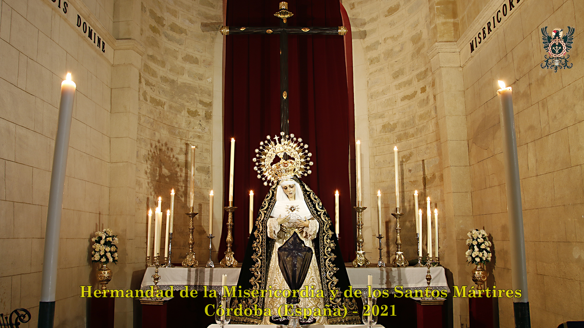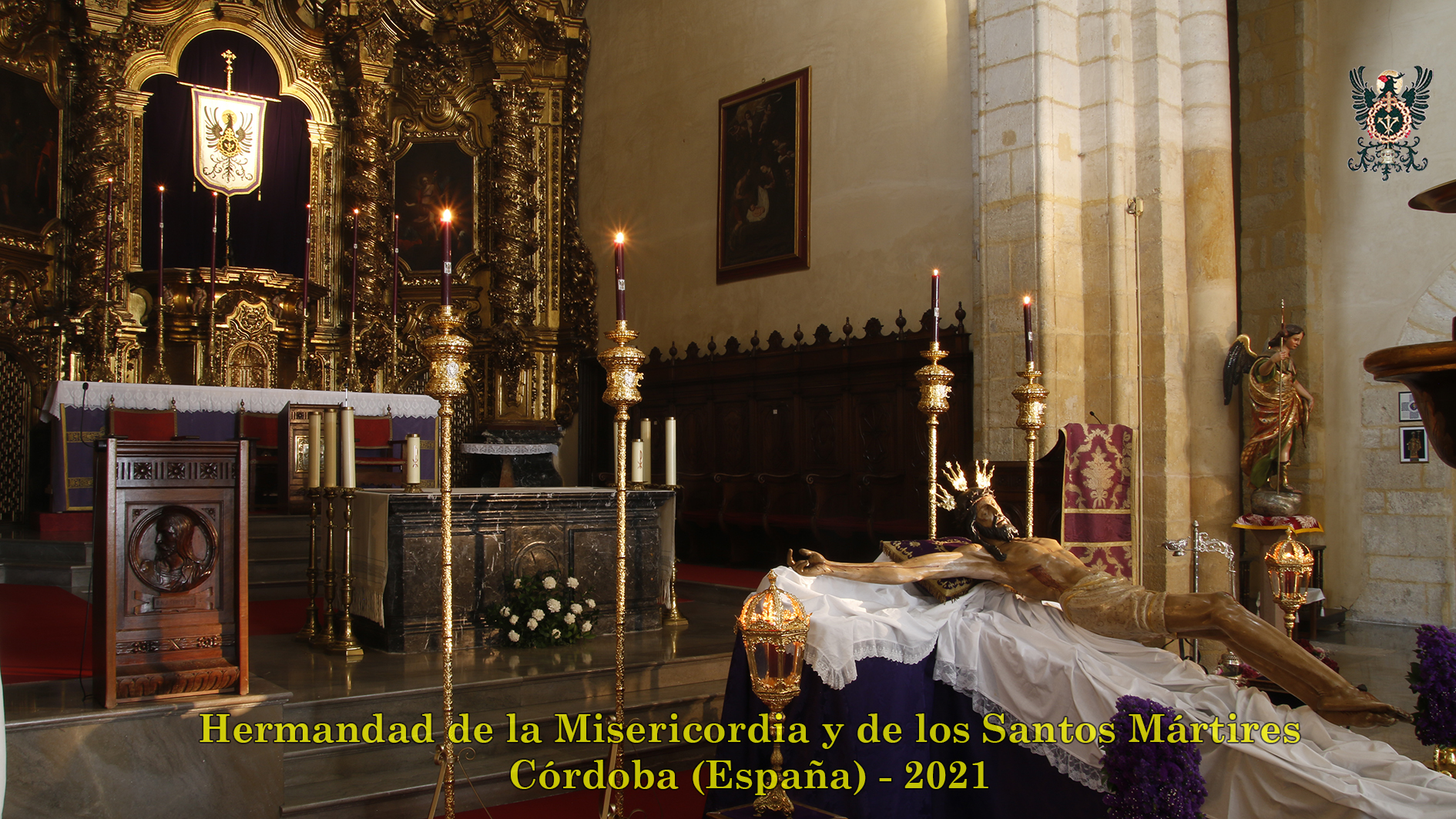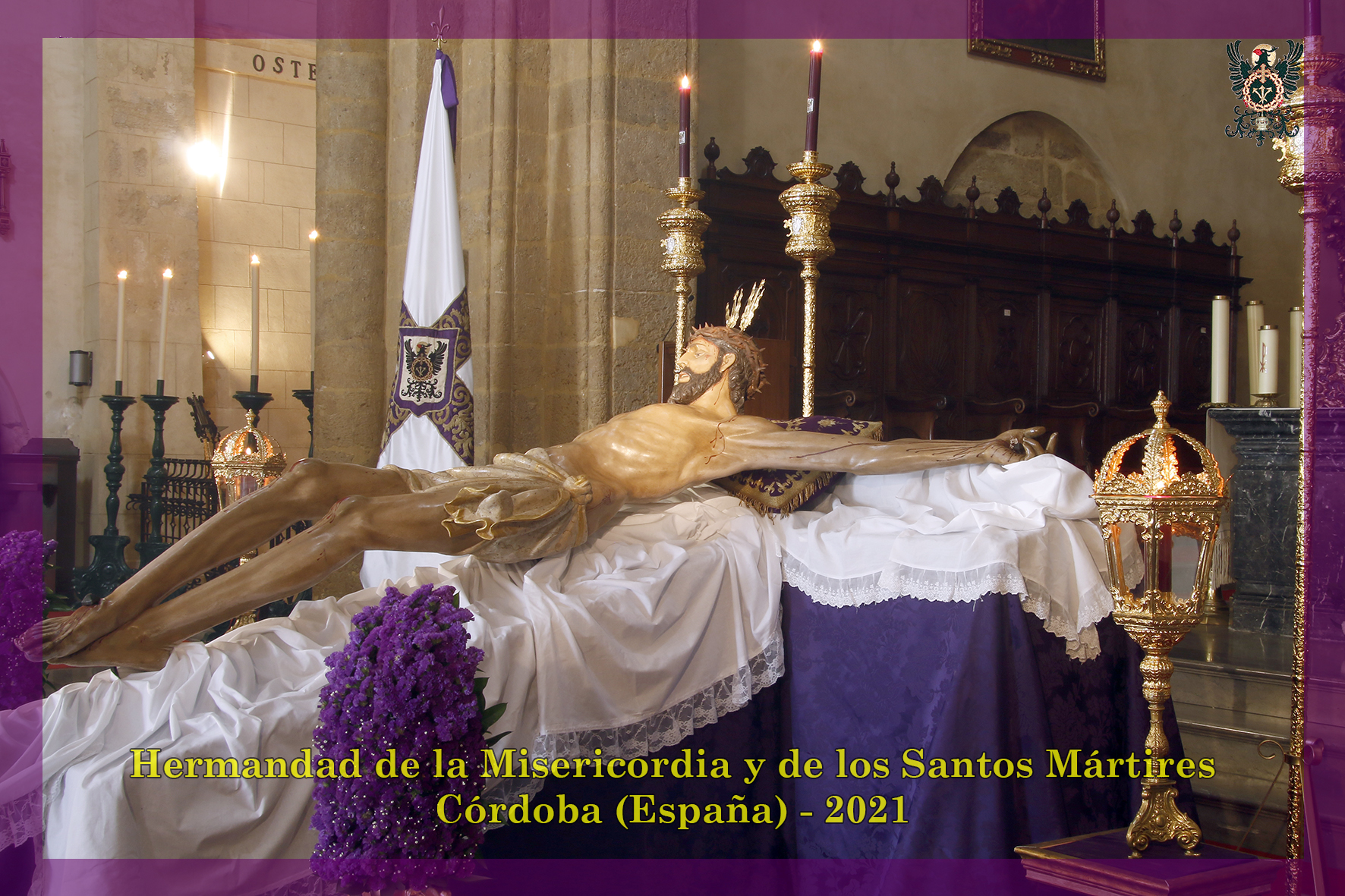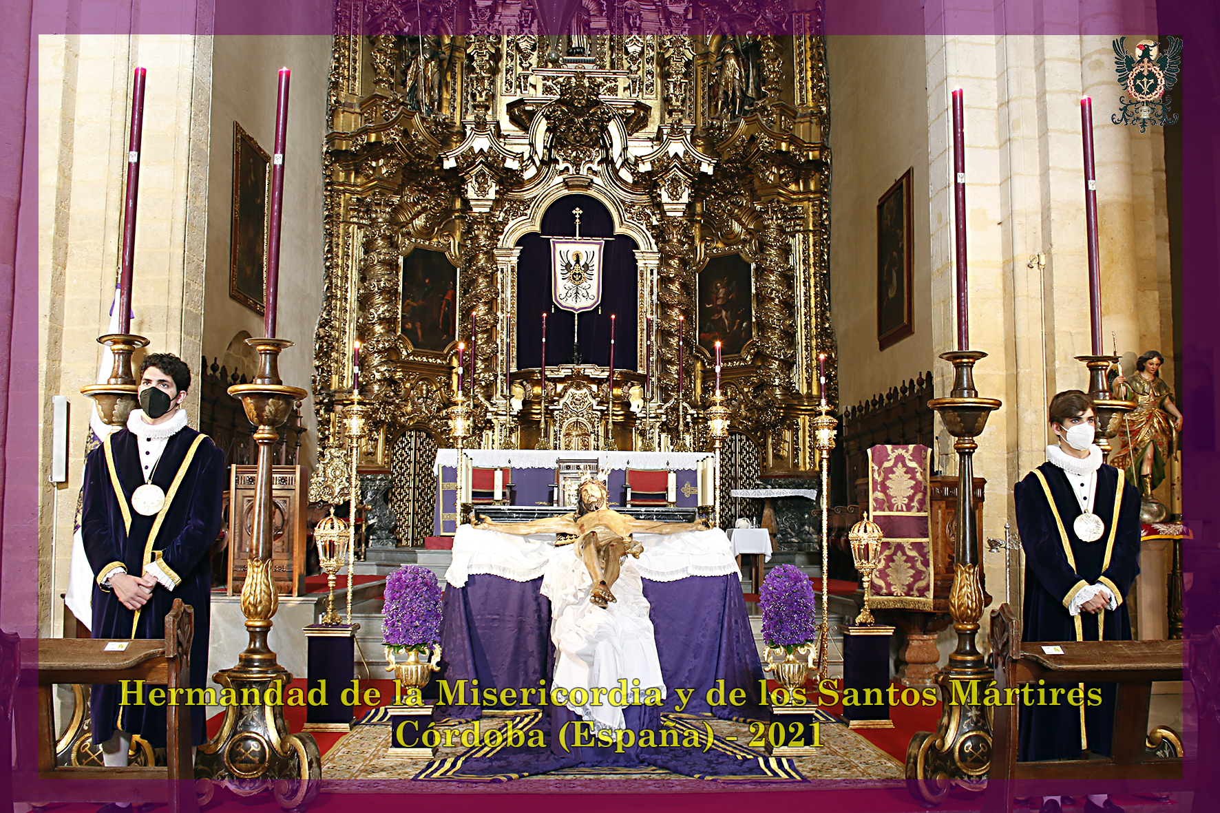 Durante todo el día estuvo expuesta a la veneración de los fieles y hermanos, aunque no se pudieran besas sus pies, la sagrada imagen del Santísimo Cristo de la Misericordia. En una presentación elegantísima, preparada por el equipo de Mayordomía, destacaba la centralidad del Crucificado, entre un sobrio exorno de flores y cirios morados, con el escudo de armas en la hornacina central del retablo mayor.