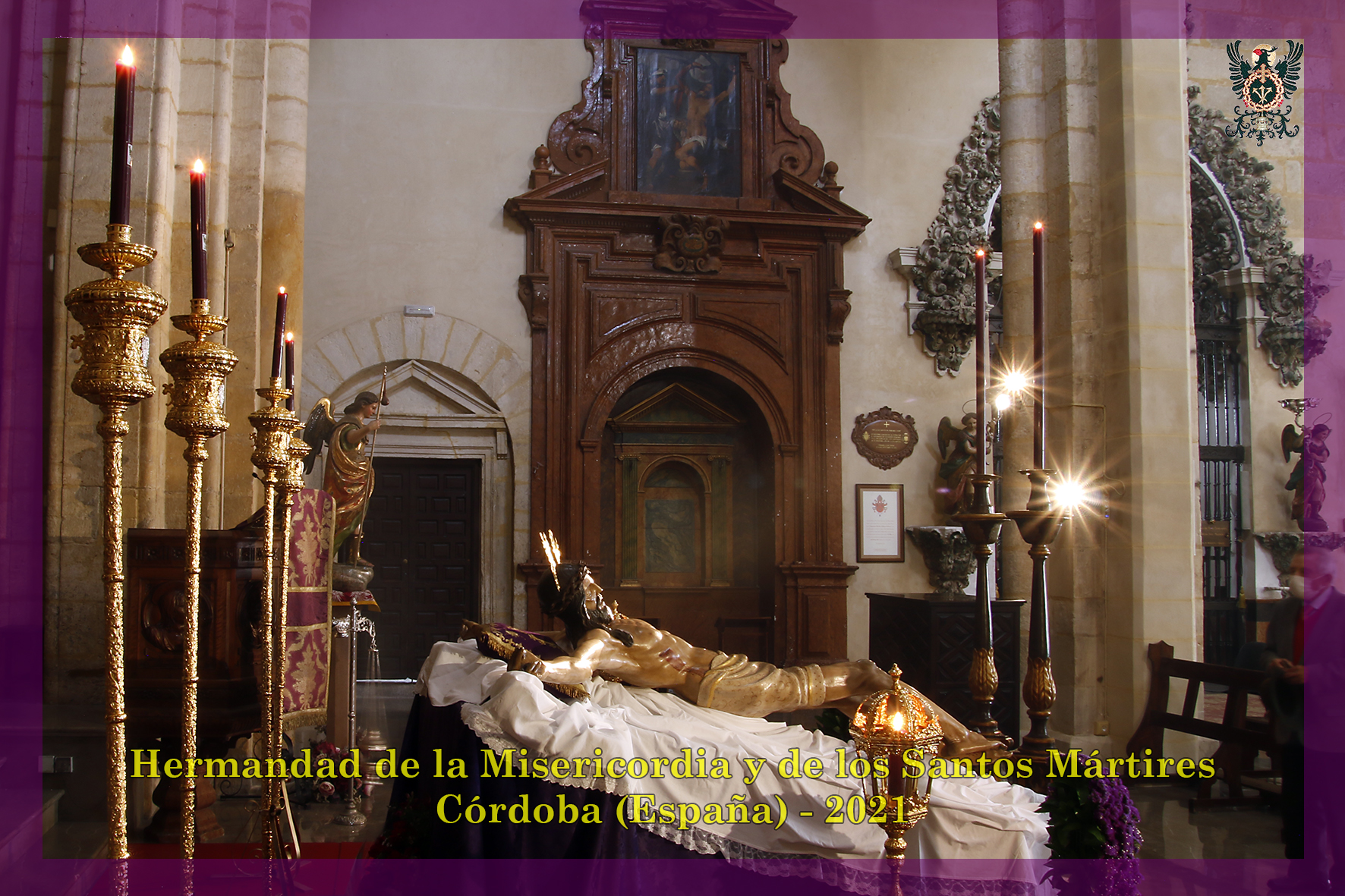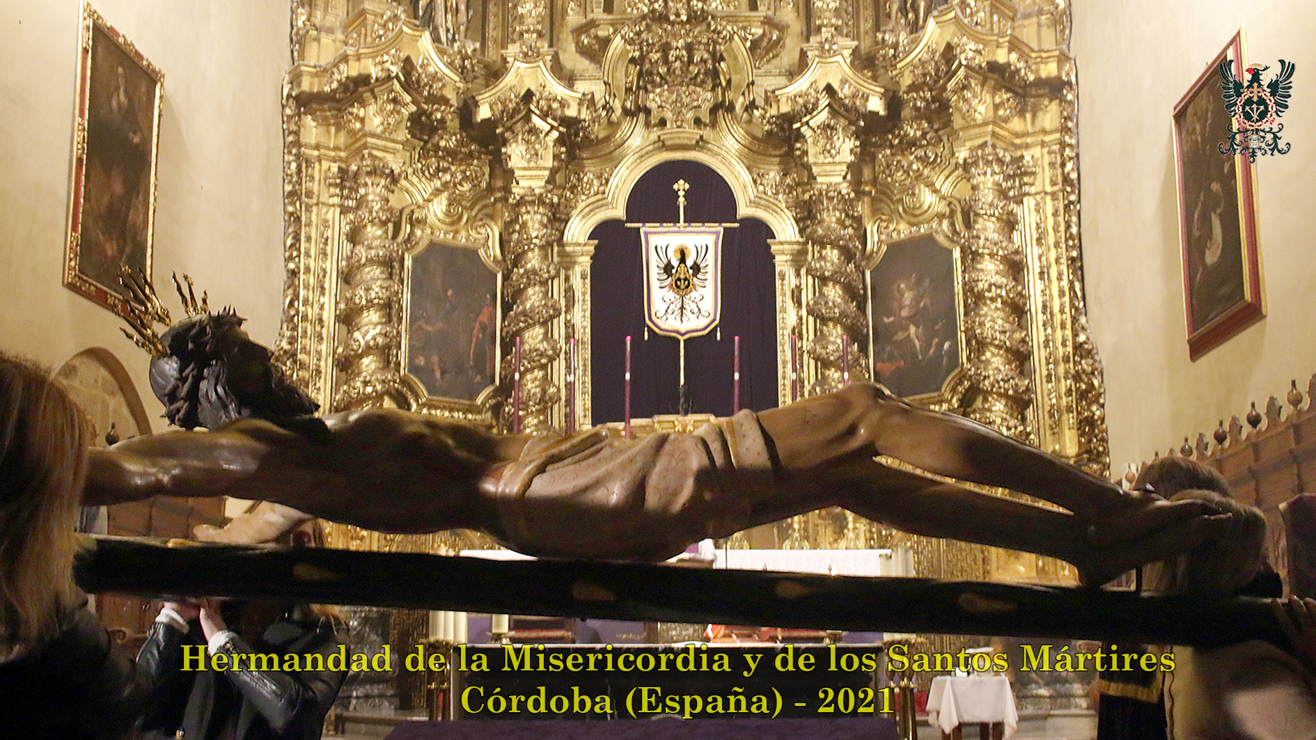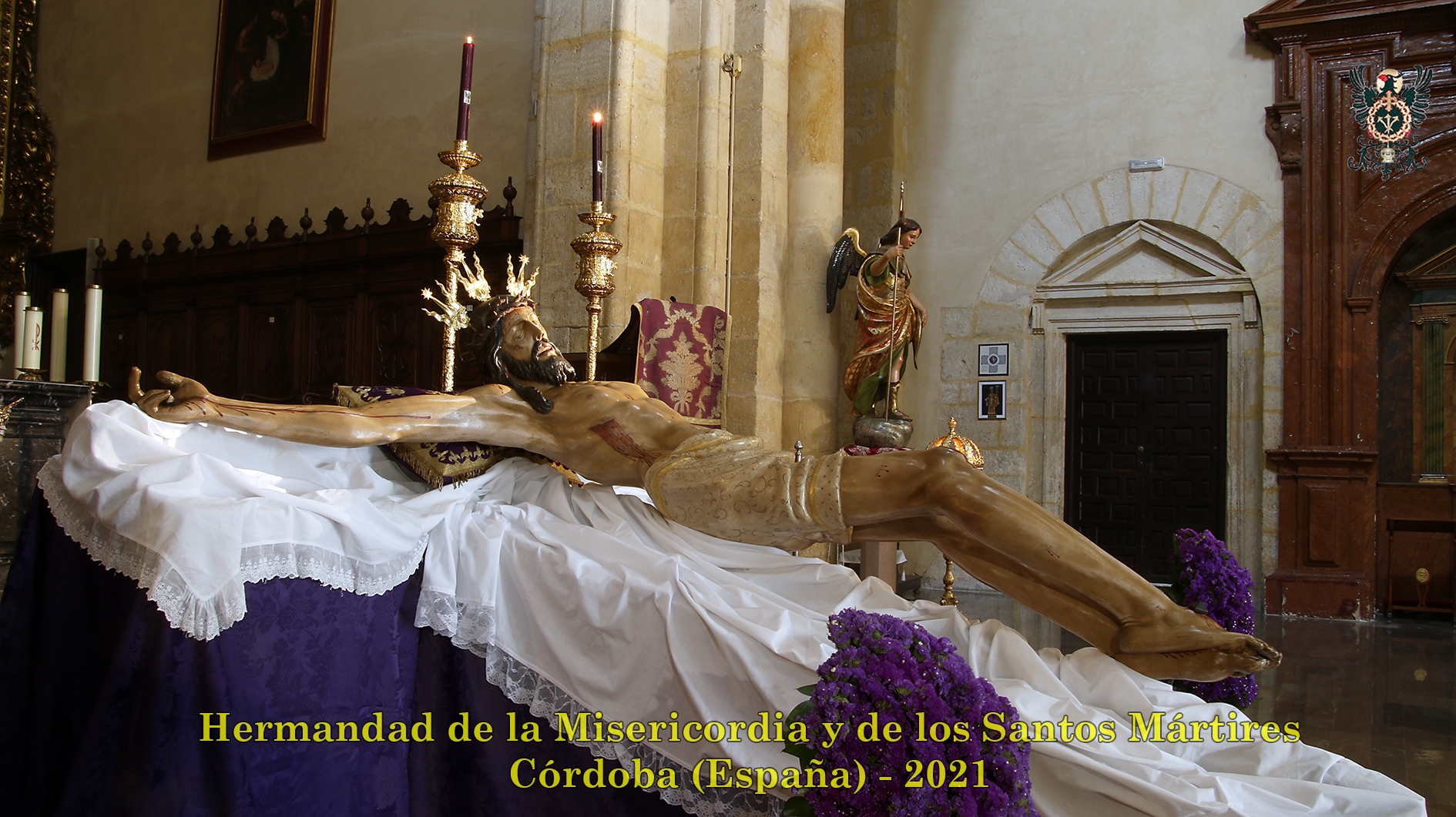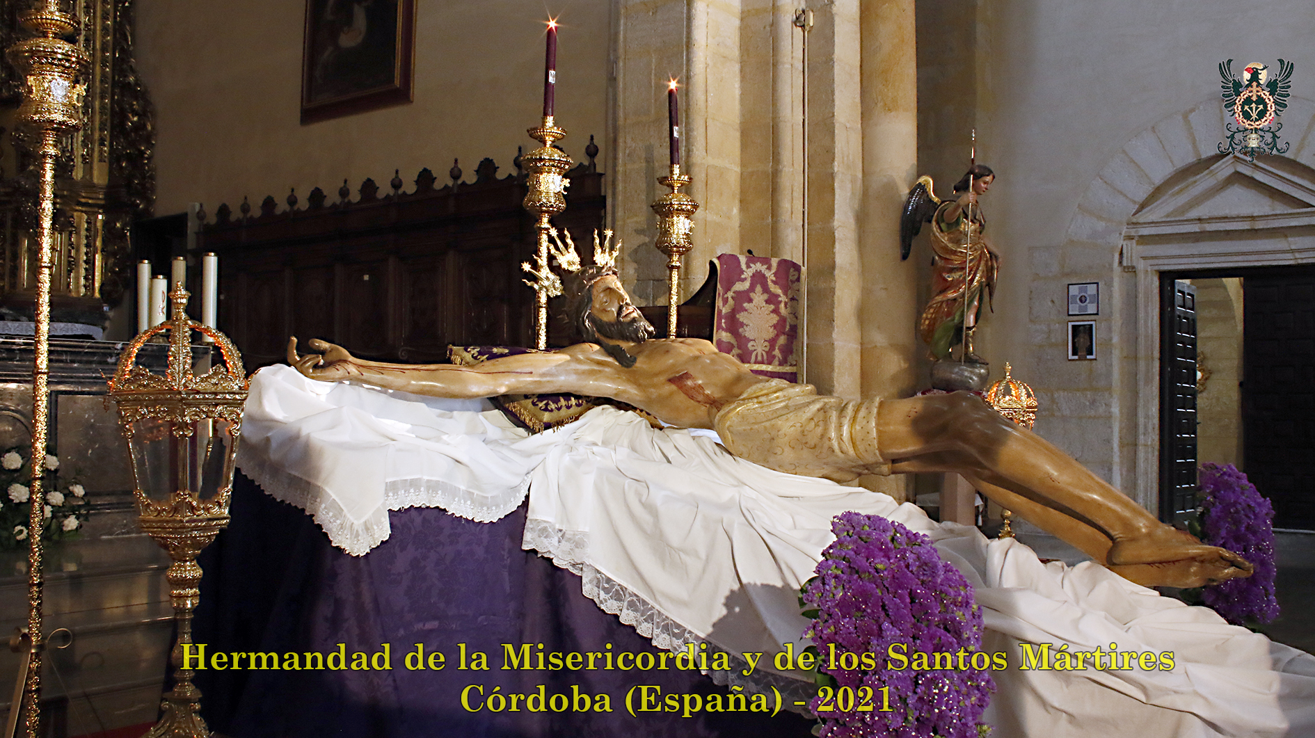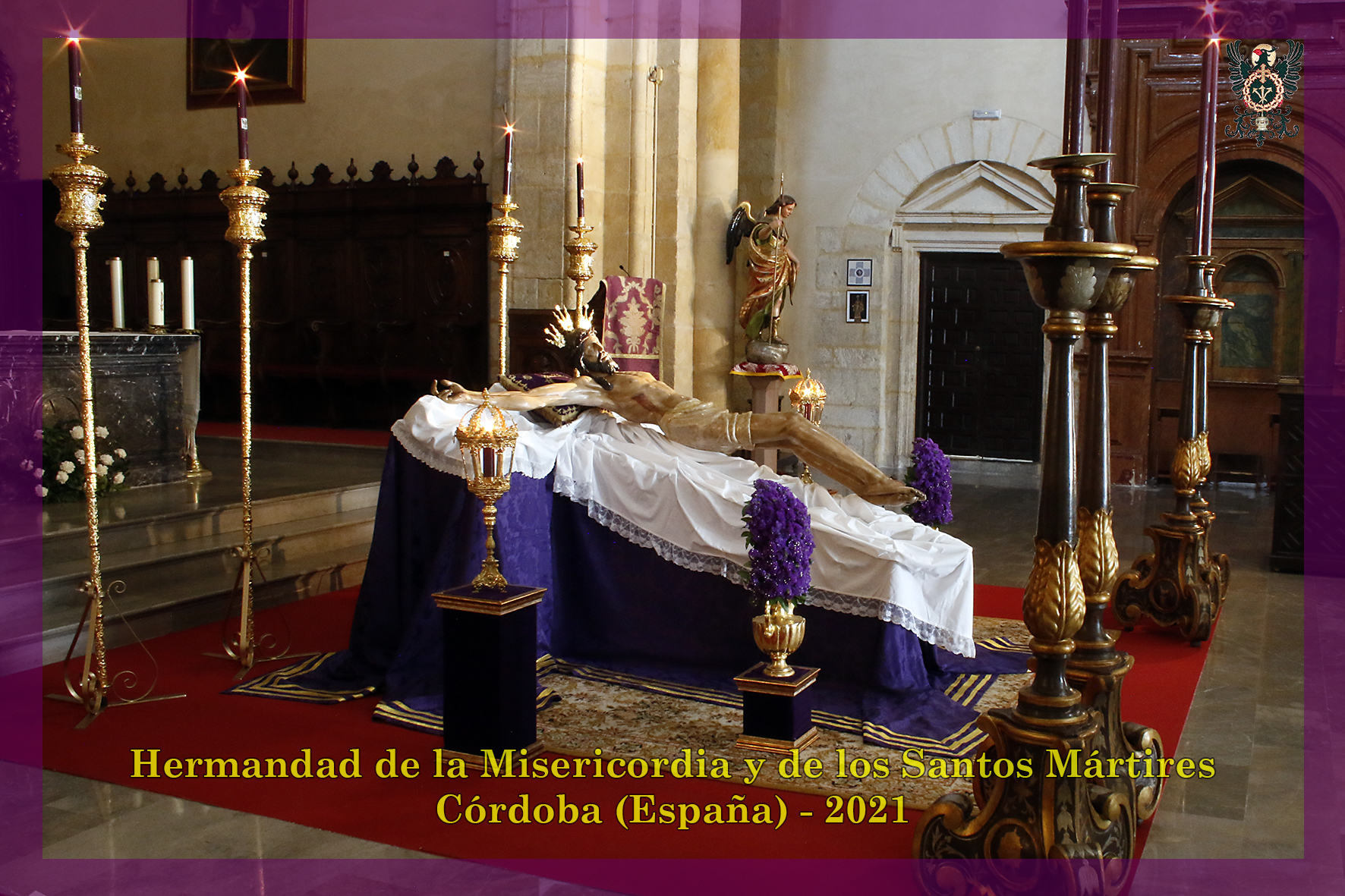 Durante todo el día estuvo expuesta a la veneración de los fieles y hermanos, aunque no se pudieran besas sus pies, la sagrada imagen del Santísimo Cristo de la Misericordia. En una presentación elegantísima, preparada por el equipo de Mayordomía, destacaba la centralidad del Crucificado, entre un sobrio exorno de flores y cirios morados, con el escudo de armas en la hornacina central del retablo mayor.