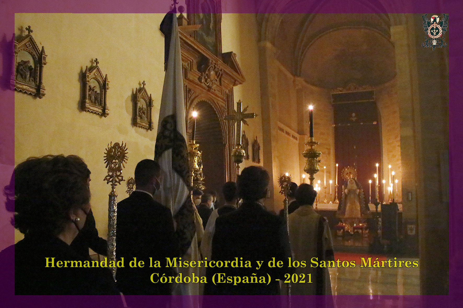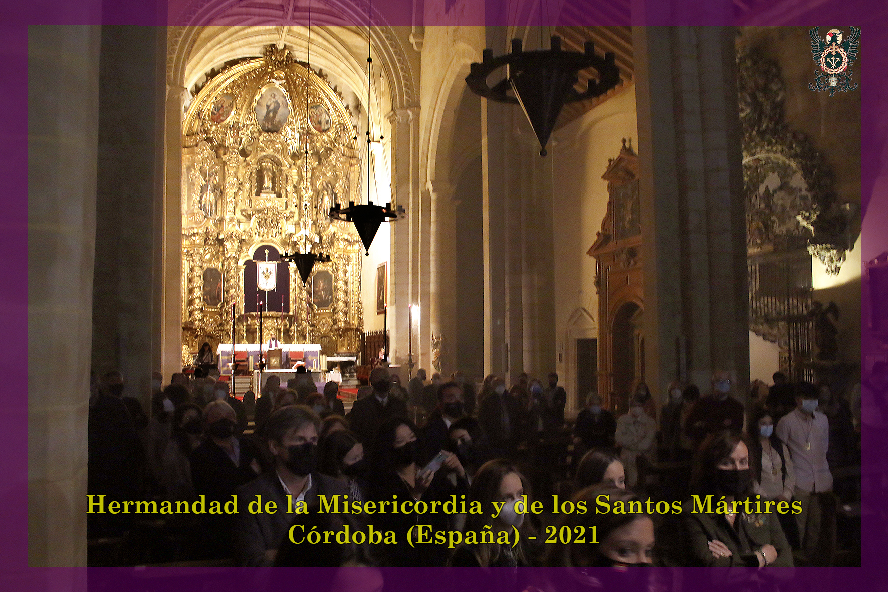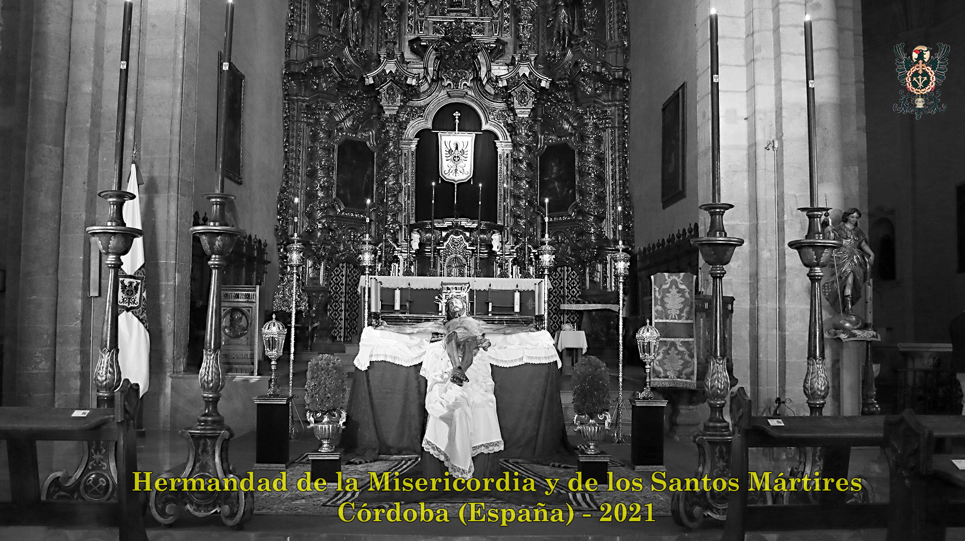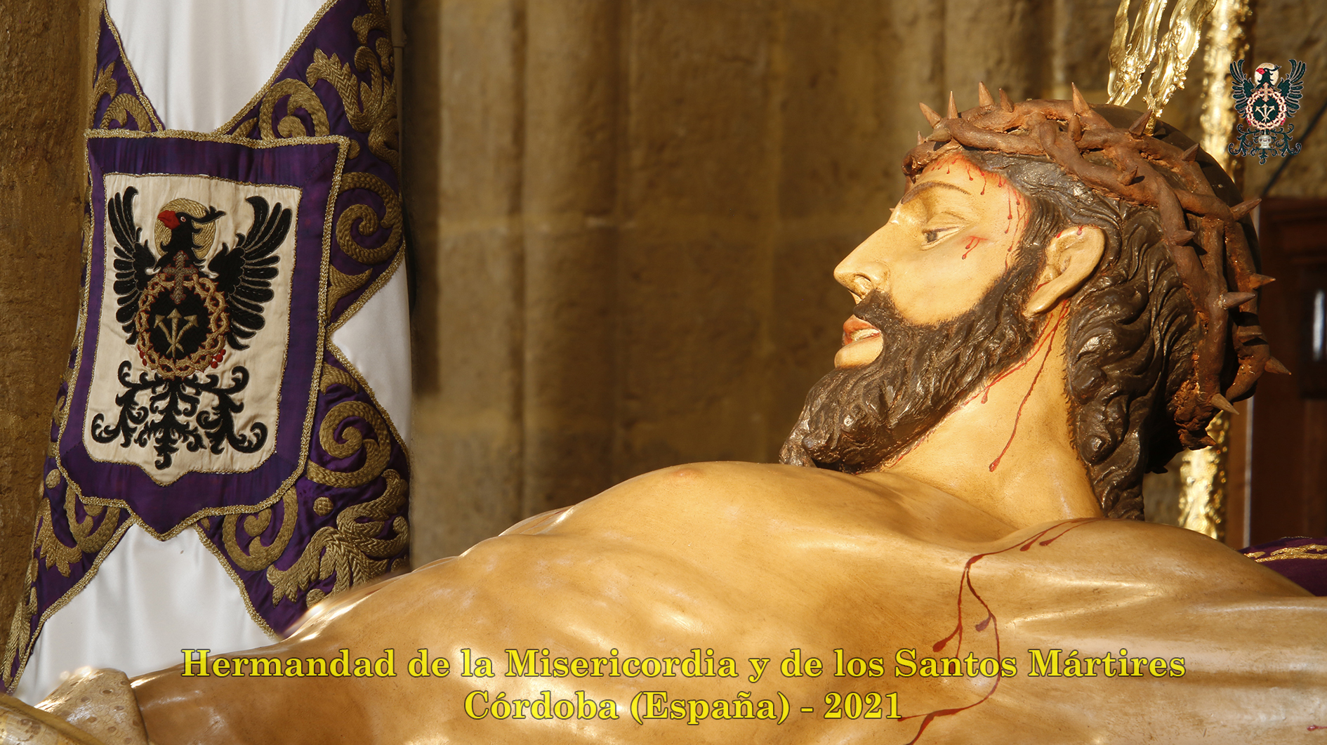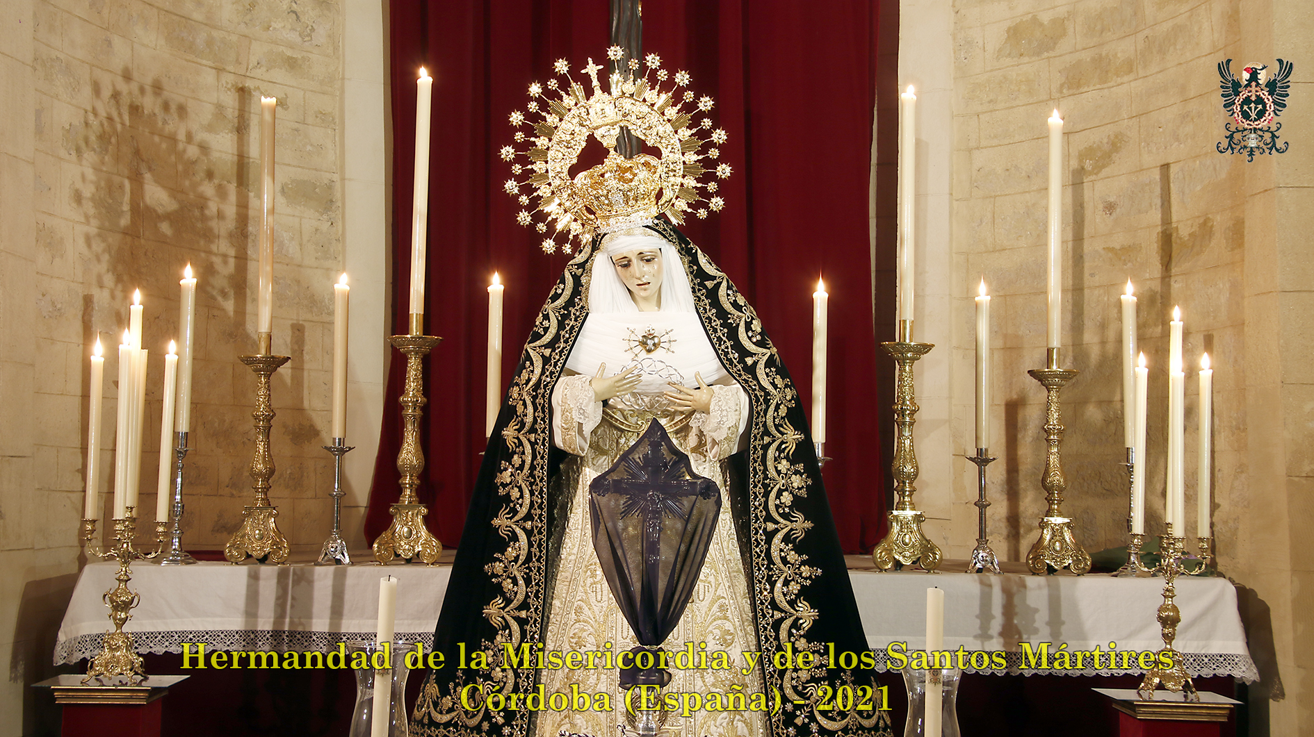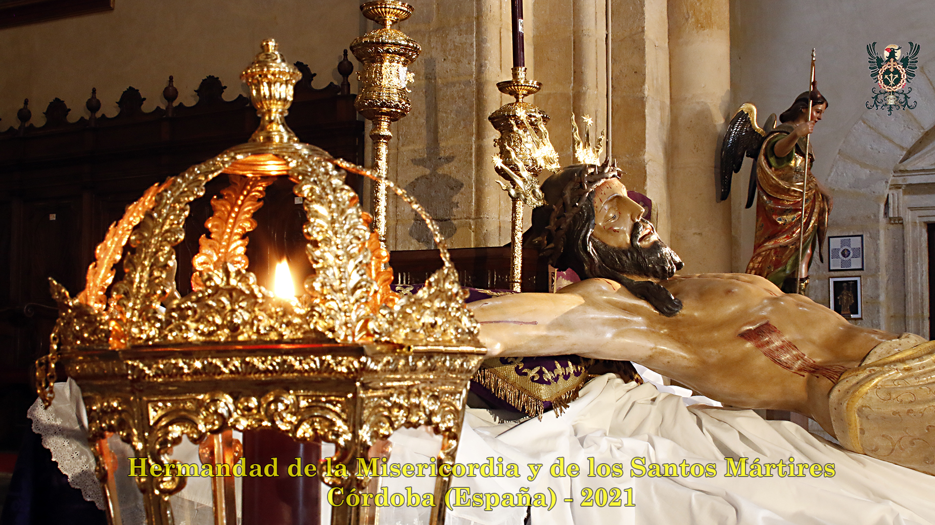 Durante todo el día estuvo expuesta a la veneración de los fieles y hermanos, aunque no se pudieran besas sus pies, la sagrada imagen del Santísimo Cristo de la Misericordia. En una presentación elegantísima, preparada por el equipo de Mayordomía, destacaba la centralidad del Crucificado, entre un sobrio exorno de flores y cirios morados, con el escudo de armas en la hornacina central del retablo mayor.