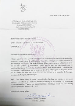 Asimismo, las Misioneras Carmelitas del Sagrado Corazón han enviado una cariñosa carta el Hermano Mayor agradeciendo el donativo de 3.000 euros que, como cada año por estas fechas, nuestra Hermandad les envía como ayuda al Centro de Rehabilitación Nutricional que tienen en Namapa, provincia de Nampula, en Mozambique. Se trata de un centro, al que nuestra Hermandad ayuda desde hace más de quince años, que presta ayuda a madres de niños con deficiencias nutricionales. A lo largo de estos años, las aportaciones de la Hermandad, gracias a la generosidad de nuestros hermanos, suman ya más de 50.000 euros.