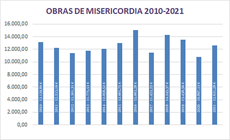 Con esta cantidad, la Hermandad ha destinado al programa Obras de Misericordia la suma total de 140.395,48 euros en el periodo comprendido entre 2010 y 2021, lo que supone un promedio de 11.699,62 euros por año.