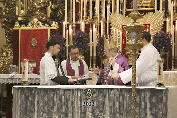 Al término de la celebración, y antes de impartir la bendición, monseñor Asenjo bendijo las medallas de la Hermandad que fueron impuestas a los hermanos que han ingresado en nuestras listas después de la Fiesta de Regla del año pasado.