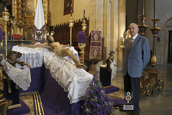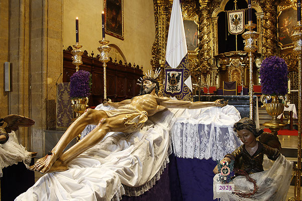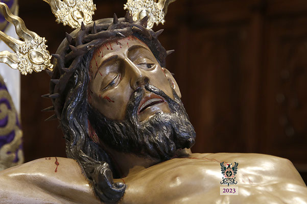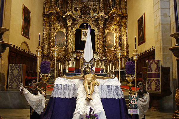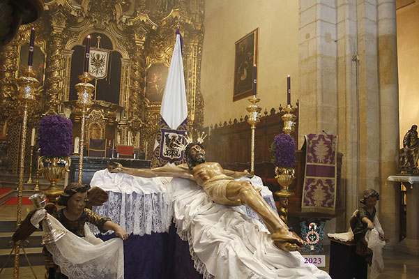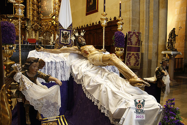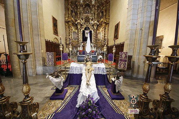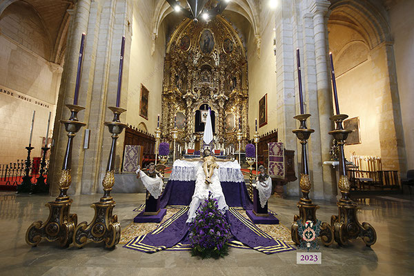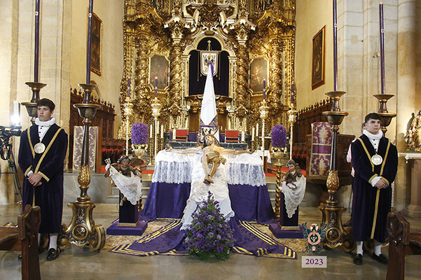 Por la mañana, el Santísimo Cristo de la Misericordia estuvo expuesto a la veneración de los fieles en la Basílica de San Pedro. Muchas personas -pertenecientes o no a nuestra Hermandad- y numerosos grupos de jóvenes estudiantes, visitaron el templo y rezaron ante nuestro Titular. La imagen se hallaba dispuesta en el emplazamiento habitual para este tipo de veneración, en una sobria y elegantísima presentación preparada por el equipo de Mayordomía.