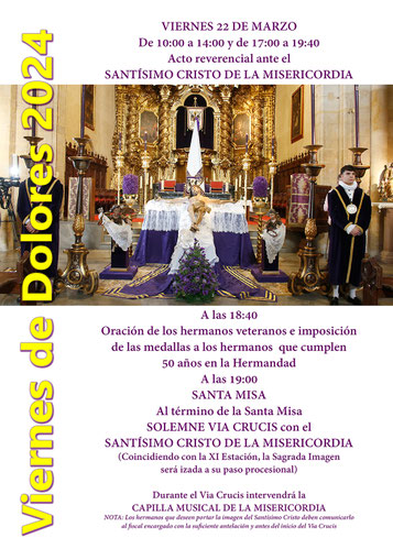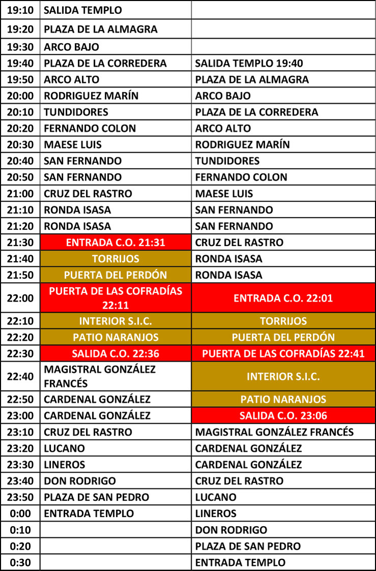 - Se recuerda que el acceso a la parroquia en la tarde del Miércoles Santo y a la recogida de la cofradía está vedado a todos los que no participan en la estación de penitencia como nazarenos, costaleros o auxiliares. Esta prohibición se hace extensiva a los padres cuyos hijos forman en la cofradía como esclavinas.